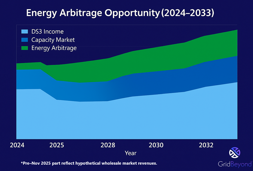 GridBeyond’s analysis shows that under the new structure, a 10 MW battery, 2-hour duration could see 12–37% higher annual revenue by participating in the wholesale market compared to DS3-only operations.