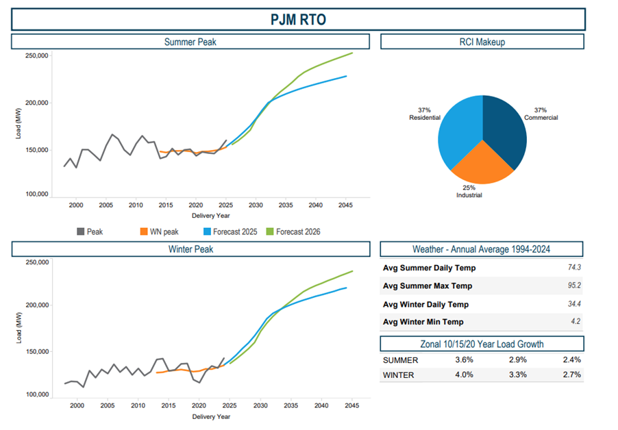 The 2025 report had predicted that peak load for summer 2025 would be approximately 154,000MW under normal peak conditions; the actual load came in at over 161,000MW due to a June heat wave that led to a spike in energy demand. PJM expects its summer peak to climb to over 241,000MW over the next 15 years. The record summer peak for the PJM footprint was 166,929MW in 2006.